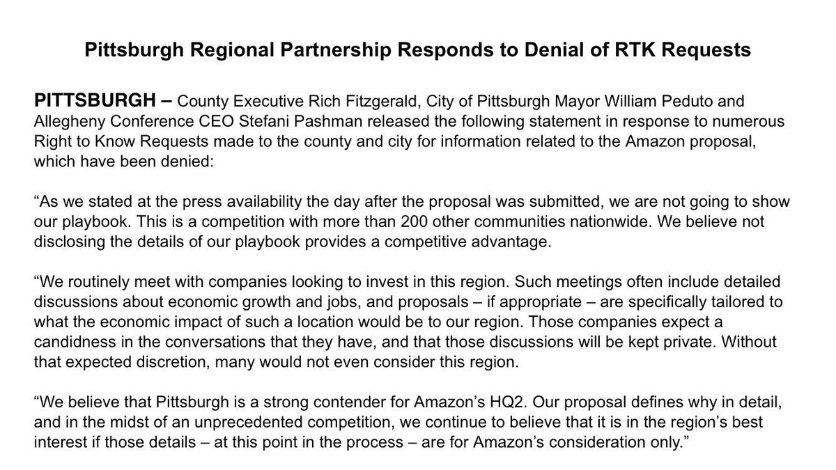 In Pittsburgh, investigative news website PublicSource submitted multiple requests for information about the bid, including emails between the mayor and his chief of staff — usually considered public record — and proposed locations for the Amazon headquarters. After five weeks of silence, the City, state and county notified PublicSource the requests had all been denied. WTAE also submitted requests for information, which officials denied.